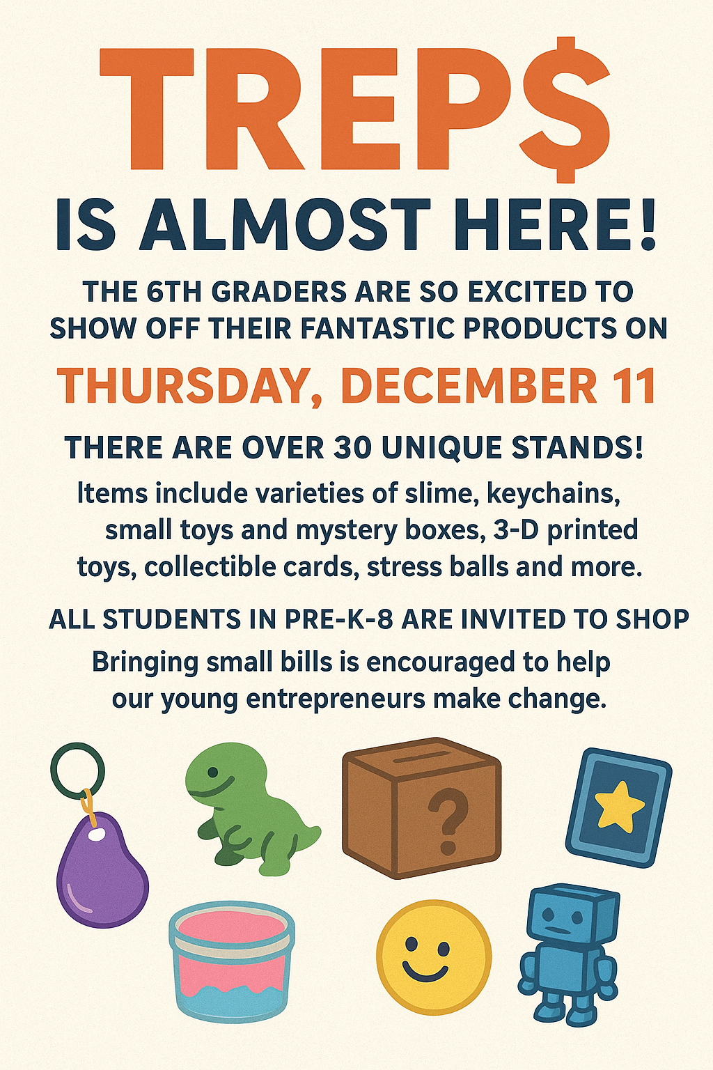 6th Grade TREPS Projects will be on sale on Thursday, December 11th. Students will have the opportunity to shop! Information is attached.