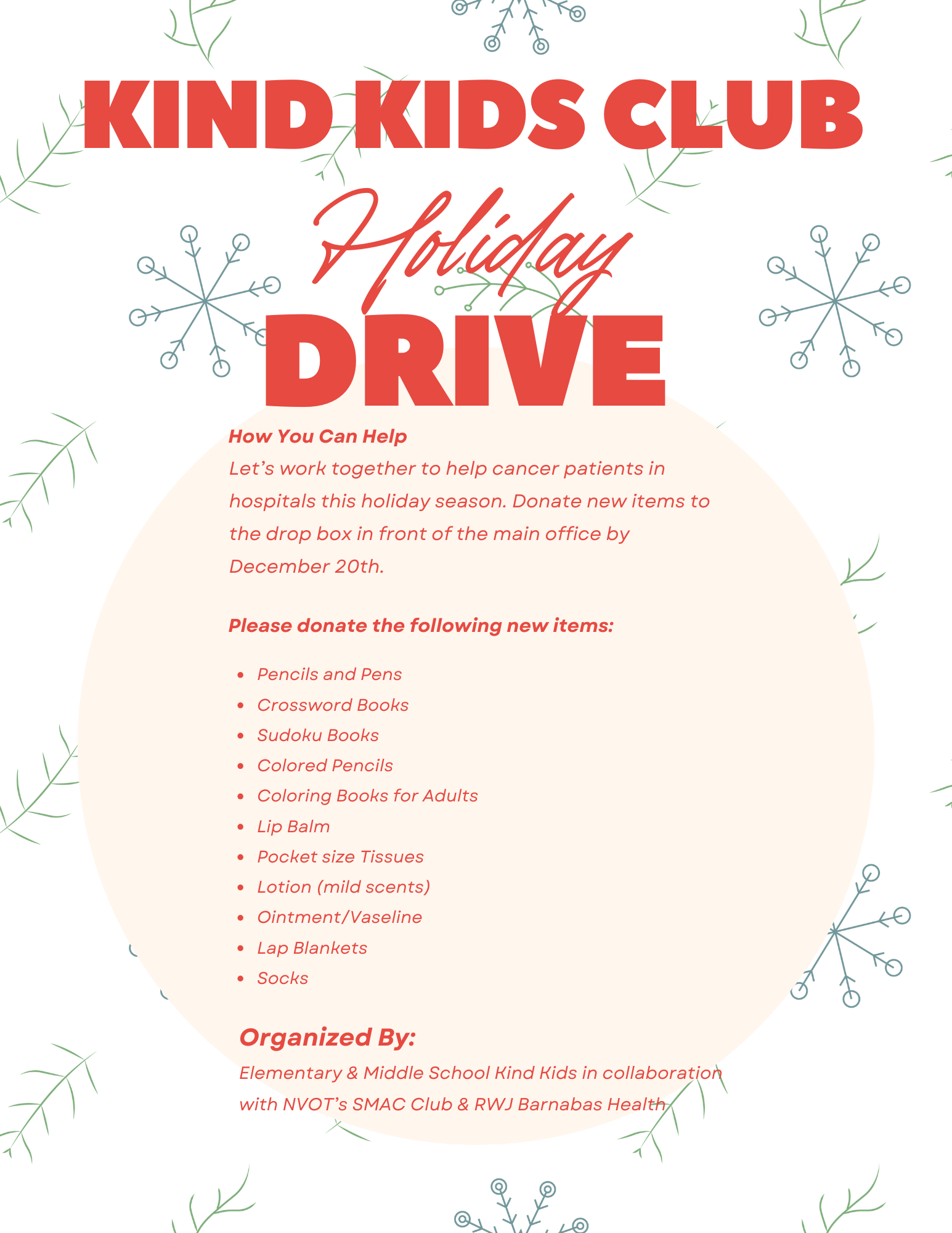 Our Kind Kids are running a Holiday Drive. Please see the attached flyer. The donation bin is located outside the main office.