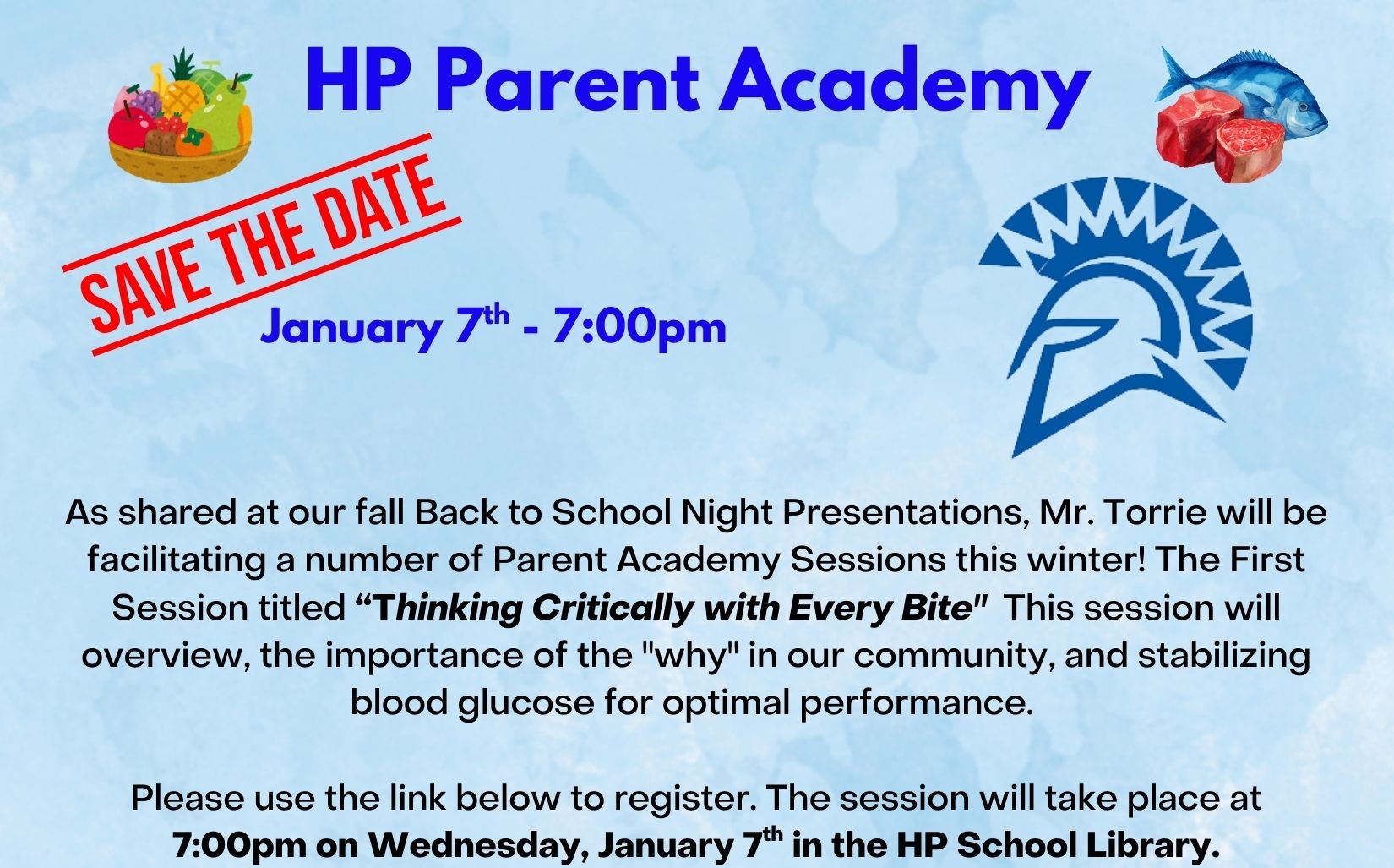 Save the Date: Wednesday, January 7th - Mr. Torrie will be facilitating a number of Parent Academy Sessions this winter! The First Session is titled “Thinking Critically with Every Bite." This session will overview the importance of the "why" in our community, and stabilizing blood glucose for optimal performance. Please use the link below to register. The session will take place at 7:00 pm on Wednesday, January 7th, in the HP School Library. Please see the flyer attached and complete the attendance form here.