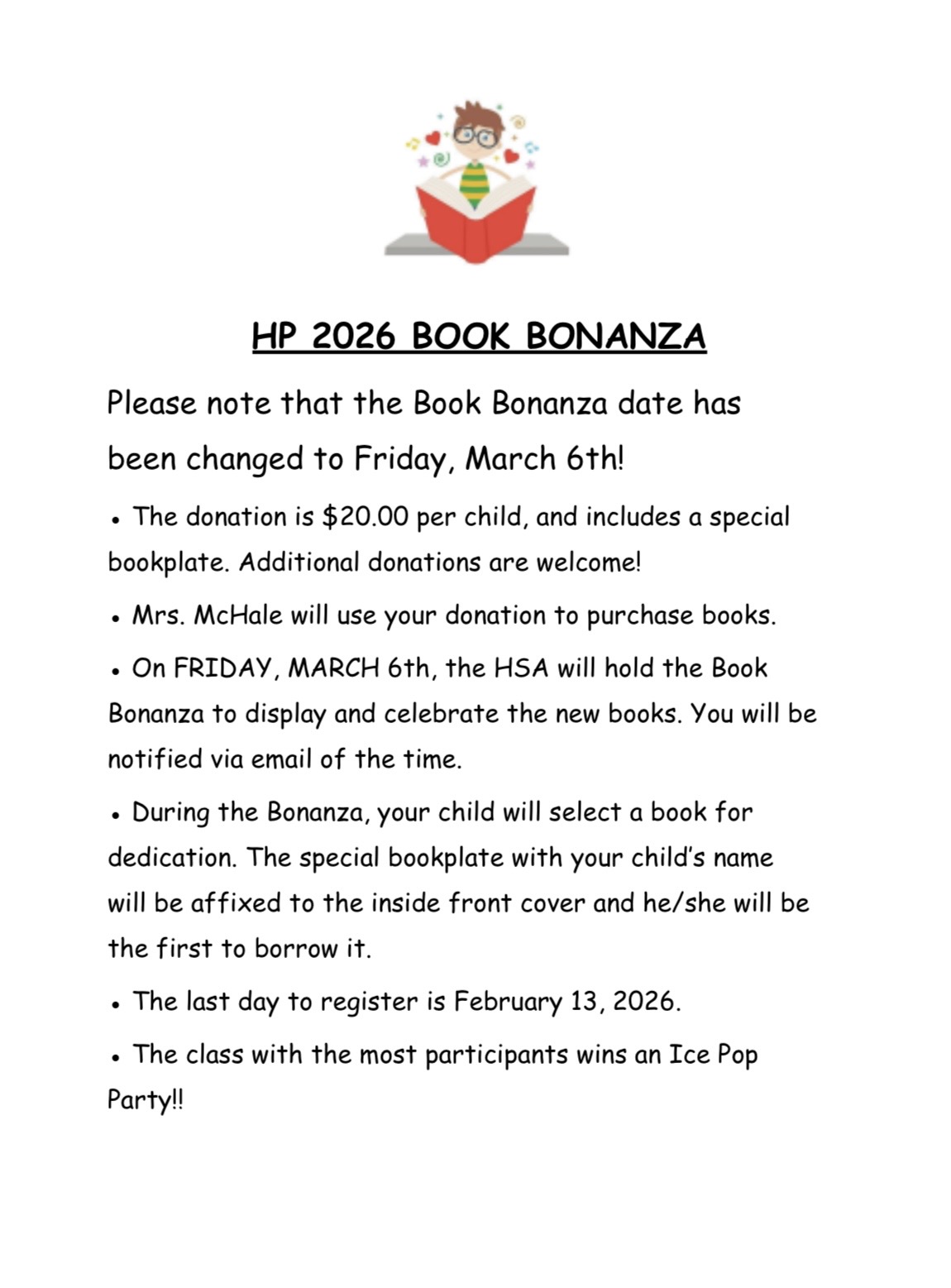Please see the attached HSA Book Bonanza information, which now has a REVISED date to end Read Across America week.