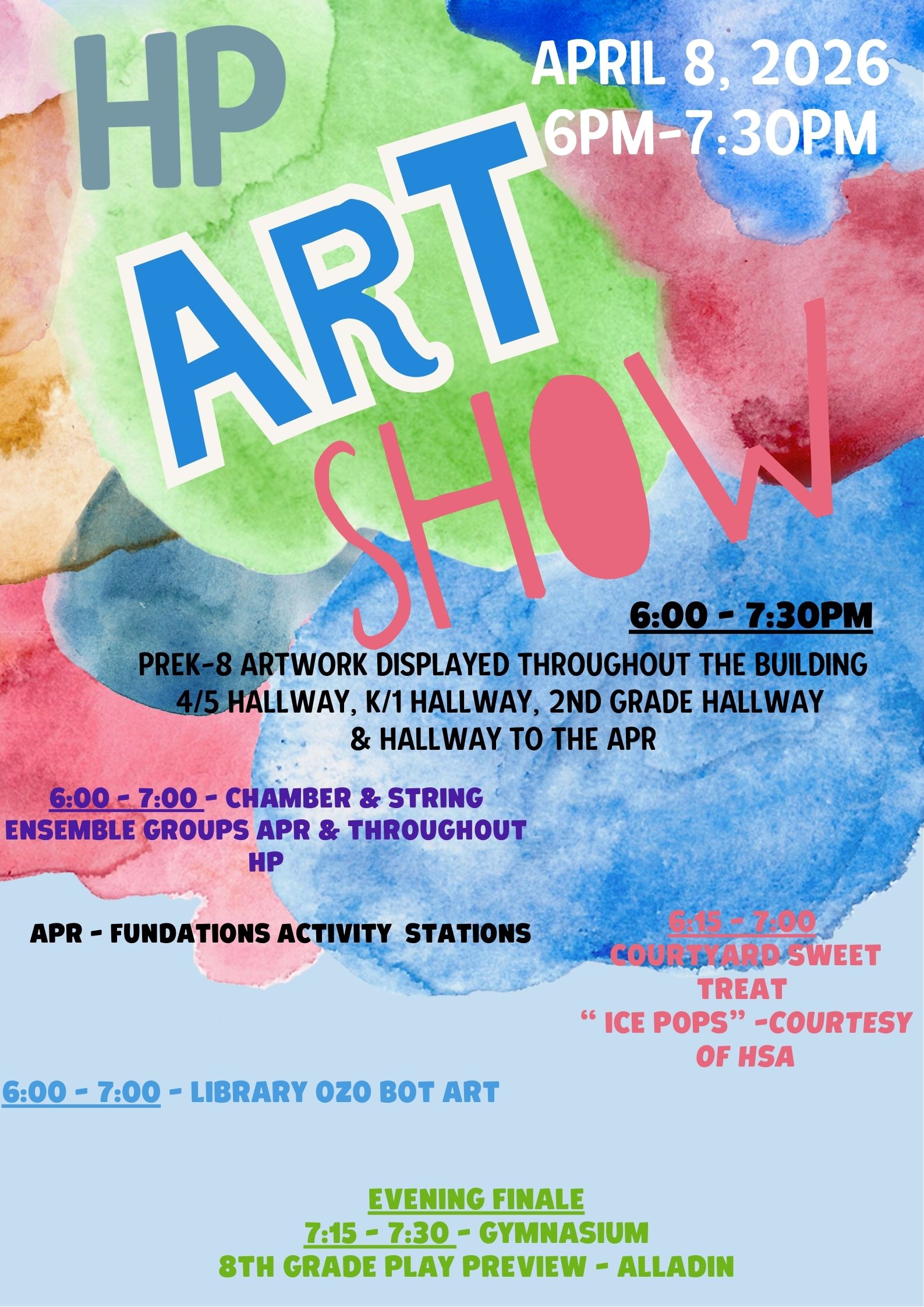 Please SAVE THE DATE for the Annual HP ART SHOW APRIL 8TH - 6:00 PM-7:30 PM - Flyer Attached.