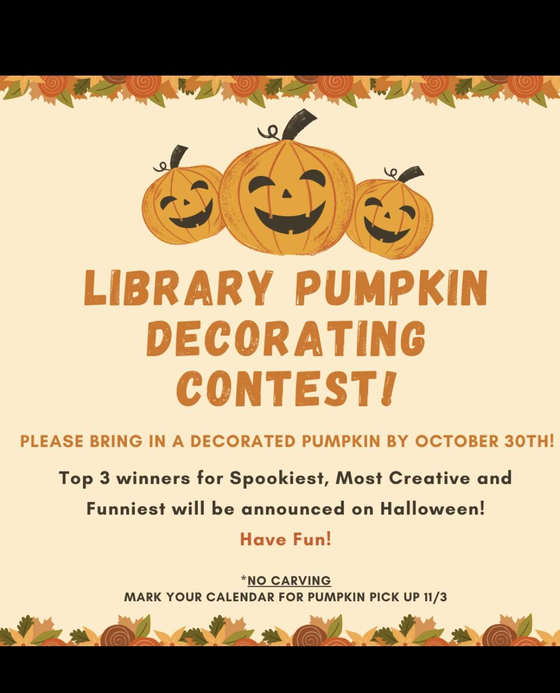 In fall happenings, the annual Library Pumpkin Contest is underway. Please see the attached flyer for rules and guidelines.