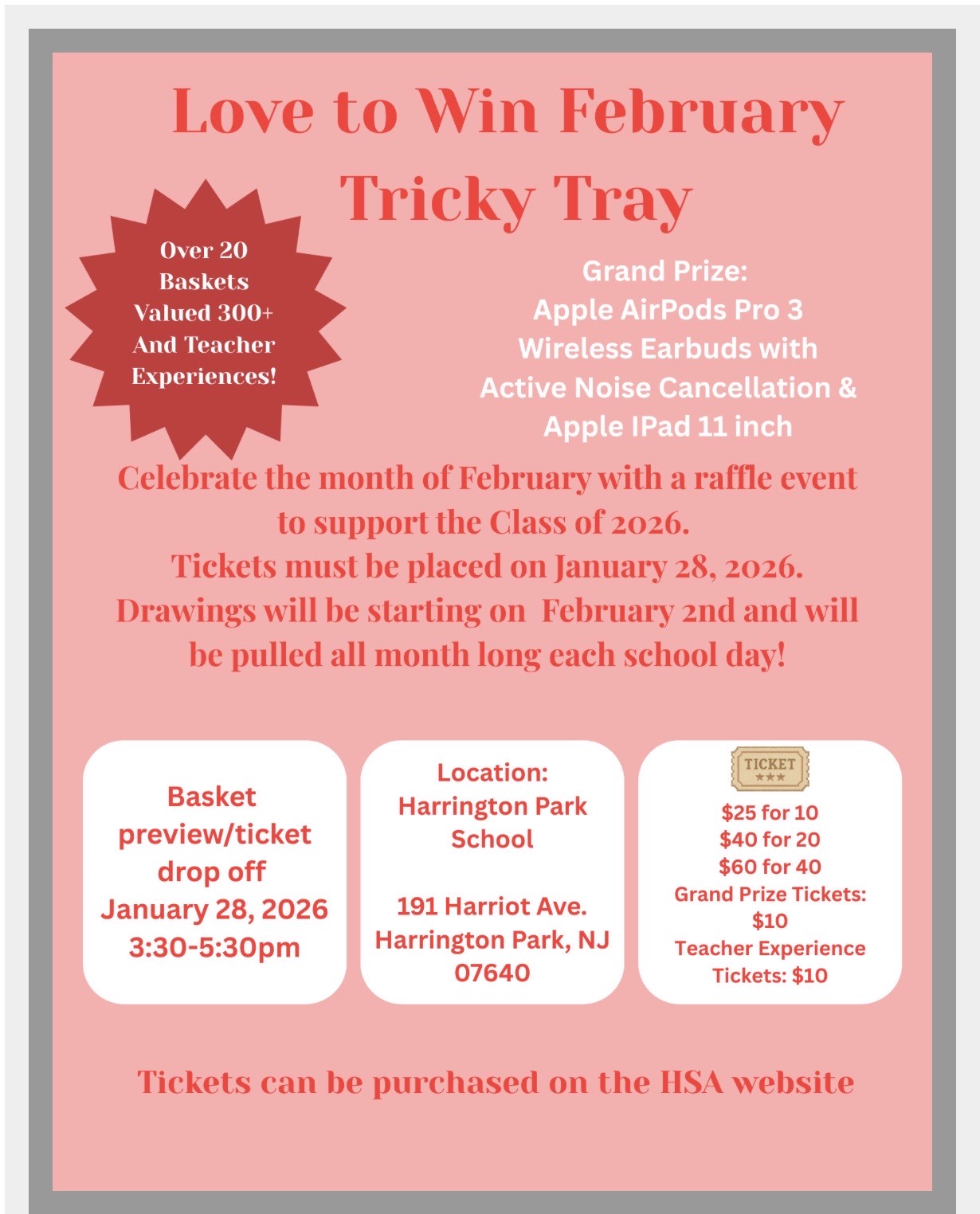 The HSA is raffling off the most coveted parking spot in front of the school. If you win, the parking spot is yours from 2/01/2026 - 6/25/2026! Don't wait, now is your chance!! Tickets on sale until Thursday, January 29th. All proceeds will help support the HPHSA's student programs. Purchase as many as you want, increase your odds for the most sought-after parking spot. The winner will be announced Friday, January 30th, by Principal Nitzberg at 3 pm on the blacktop! https://rafflecreator.com/pages/11301/spring-prime-parking-2025-2026