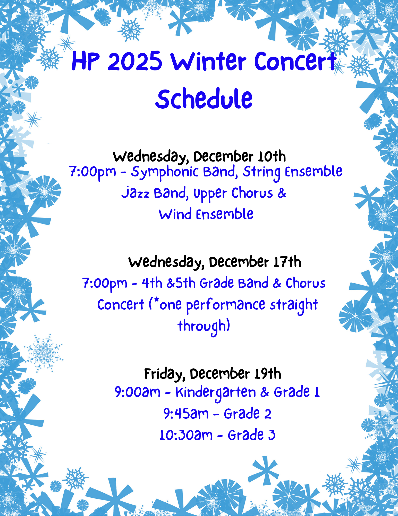 -Wednesday, December 10th - 7:00 pm - Symphonic Band, Jazz, Springs, Wind Ensemble & Upper Chorus in the Big Gym